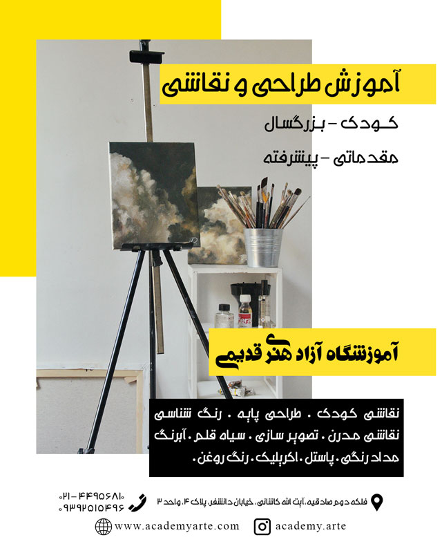 دوره های آموزش طراحی و نقاشی در بهترین کلاس آموزش طراحی و نقاشی تهران با مدرک معتبر بین المللی آموزش هنر نقاشی در بهترین آموزشگاه معتبر نقاشی تهران. آموزش طراحی پایه و پیشرفته طراحی و نقاشی سیاه قلم طراحی چهره و طراحی فیگوراتیو. آموزش نقاشی خلاقانه ویژه کودکان. آموزش نقاشی تخصصی رنگ روغن و کلاس آموزش نقاشی اکریلیک و نقاشی با پاستل گچی. دوره آموزش نقاشی مدرن و آبسترکت و نقاشی فاین آرت. آموزش نقاشی با آبرنگ و مداد رنگی و تکنیک هایپر رئال. دوره آموزش تصویر سازی تخصصی در آموزشگاه نقاشی قدیمی.